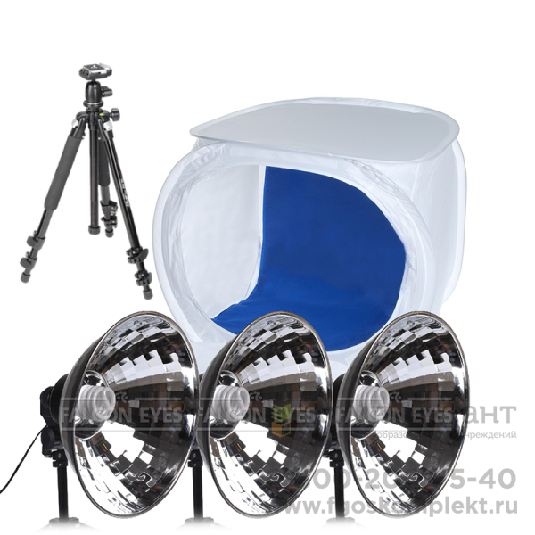 В комплект входят: Фотобокс Falcon Eyes LFPB-3, три осветительных прибора Falcon Eyes LHPAT-40−1, три стойки для освещения Falcon Eyes FEST-083/W-803.0 и штатив GreenBean Forest. Данный комплект отлично подойдет для съемки предметов, параметры которых не превышают размеры фотобокса (90×90×90см). При помощи этого набора Вы можете делать фотографии для вашего веб сайта и интернет магазина.