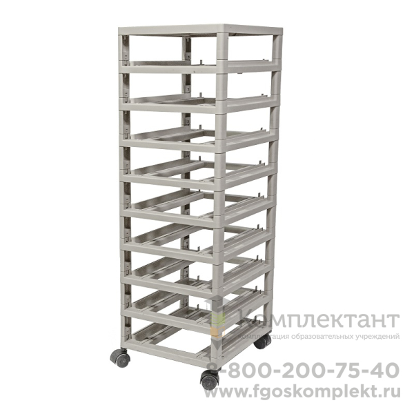 Стойка для лаборатории выполнена в виде литой конструкции из пластмассы с роликовыми колесами и имеет форму полочного стеллажа. Количество уровней стеллажа соответствует количеству контейнеров лаборатории. Стойка может быть выполнена в белом, сером или бежевом цвете.