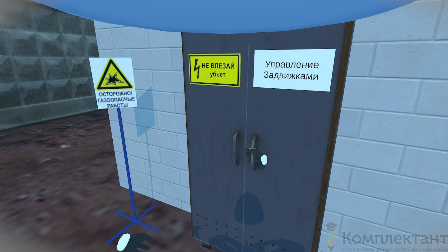 Виртуальный (VR) тренажер «Газоопасные работы» воссоздает ситуацию, в которой пользователь попадает в колодец глубиной 4 метра, где ему необходимо провести осмотр трубы, используя газоанализатор и противогаз, в условиях недостатка кислорода и наличия взрывопожароопасных загрязнителей в воздухе. В симуляции можно задать дополнительное условие: допуск с неполным комплектом.